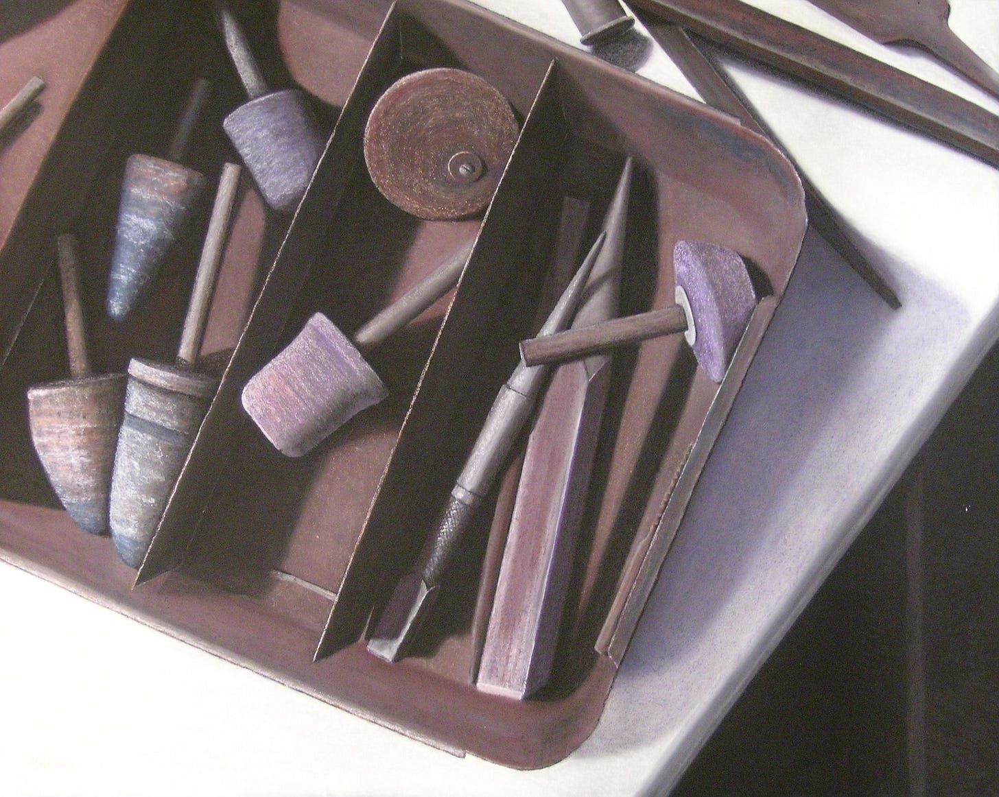 I found inspiration for paintings in the objects and artifacts left in the gradually-unused spaces of my childhood farmstead home. This particular composition comes from a bench located in a makeshift shop converted from a small cattle shelter. It became my Dad’s place to fix things after a bigger workshop was destroyed in a barn fire.